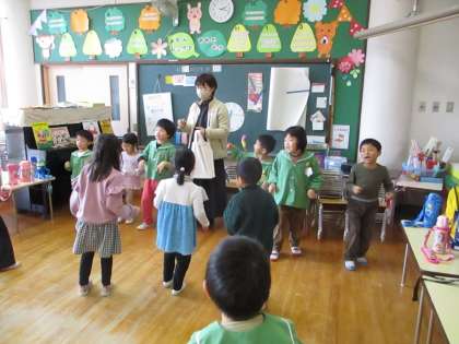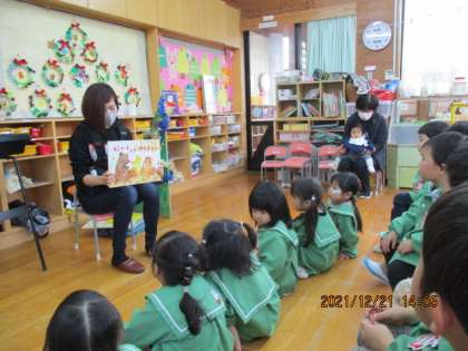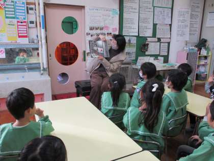 りす組では、寒い日を題材にした紙芝居を読んでもらいました。服を着こんでいた動物たちが、元気に遊んでいるうちに体が暖かくなってきたというストーリーでした。子供たちは、「縄跳びしていたら暑くなってきてスモックを脱いだよね」と自分たちの経験を重ねて楽しそうに聞いていました。
