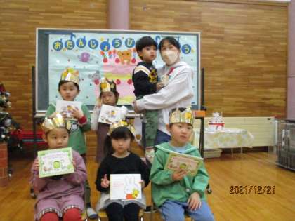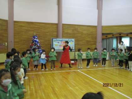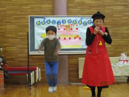今月はスペシャルゲストのゆきみだいふくさんが来られてギターに合わせてクリスマスの歌を歌ったり、ダンスを踊ったりしました。また、サンタクロースはプレゼントを運ぶために体を鍛えているため、代表の友達が足や腰、腕、頭を鍛える運動を考え、みんなで鍛えました。もうすぐ、クリスマスですね。素敵なプレゼントを貰えるといいですね。