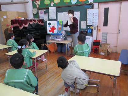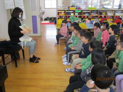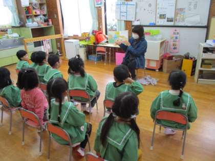 PTAのお母さん方主催の読み聞かせ会がありました。幼稚園にはない絵本を読んでもらい、子供たちは新鮮な気持ちで楽しそうに聞いていました。お話を見ながらの掛け合いもあり、元気に答えながら見ていました。毎月、交代で読み聞かせに来てくださる保護者の皆さまに感謝です。教師が読み聞かせるのとは違い、「○○ちゃんのお母さんだ!」「今日は僕のお母さんが来るんだよ」と毎月楽しみに待ち、新鮮な気持ちでお話を聞いている子供たち。子供たちの興味がある物や事、季節やその時期にあった題材などから選び、準備してくださっています。本当に毎回ありがとうございます。