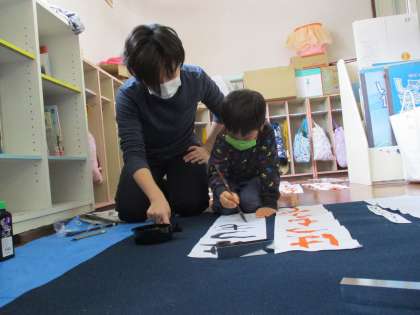 初めて筆を持つ子も多かったのですが、どの子も伸び伸びと書き、褒められると喜んでいました。小筆で自分の名前を書くことにも苦戦しながら、鉛筆との違いを感じつつ書いていました。部屋に飾ると、友達の作品を見ながら「上手に書けているね」「大きく書けたね」と話していました。とても良い経験となりました。