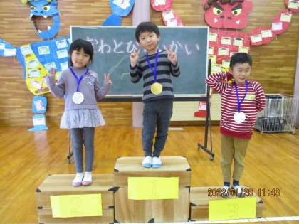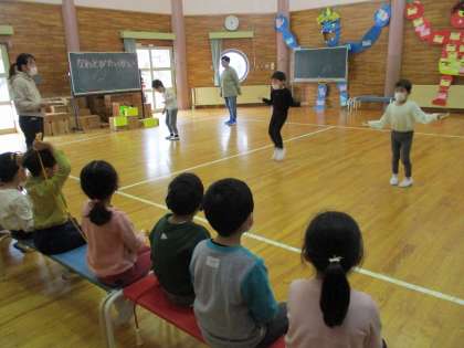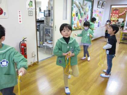 縄跳び大会が始まり、まずはいろいろな跳び方を年少組さんの前で発表しました。前跳び、後ろ跳び、あや跳び、ケンケン飛び、駆け足跳びです。自分の自信のある跳び方を見せ、たくさんの拍手をもらい、嬉しそうでした。その後一人2回跳び、回数の多い方を記録として残しました。1回目は緊張で記録が全く伸びず、どうなるのかと心配しましたが、2回目はリラックスして跳び、周りの声援もあって記録も伸びました。
