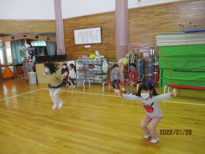 今日は縄跳び大会がありました。うさぎ組では、縄跳びが出来るようになるまでの練習段階の飛び方、ゆっくり回して跳び超えるを何度も挑戦する子、1回しで2跳躍で飛ぶ子、前跳びが出来るようになった子の3部門から、自分ができる跳び方で挑戦しました。練習の時は「もうここまででいいや」と途中で止めていた子も、今日は「もっと頑張る」と最後まであきらめずに跳んでいました。