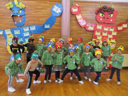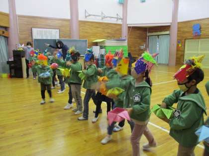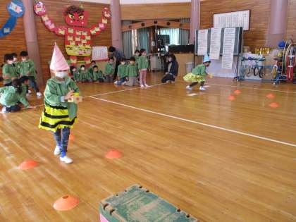 部屋で集まりをしているとうさぎ組さんが「鬼が出たので、やっつけてください」とお願いに来られました。それを聞いて勇んで遊戯室に行ったのですが鬼はおらず…「おかしいね」と言いながら、自分の心の中にいる鬼を書き、壁に吊るしてある大きな鬼に貼っていたので、それに向かって豆を投げました。「鬼は外!福は内!」と声にも力が入りました。しばらくすると、太鼓の音とともに鬼の登場。誰も泣くことなく、果敢に挑んでいました。うさぎ組さんに「鬼やっつけたよ」と自慢そうに伝えていました。