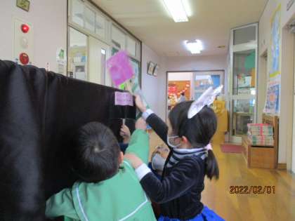 冬休み中にパン屋さんやショッピングセンターに行った経験から「パンをつくってみたい」と興味をもち、パン作りが始まりました。他にも、クラスでどんなお店屋さんをしたいかを話し合い「ペットショップ」「映画館」「レストラン」に決まり、グループに分かれてお店屋さんに必要なものをつくり、役割を決めて遊びました。レストランで、ピザやたこ焼き、ポップコーン、パンを買い、映画館で食べながらポケモンバトルの映画を見ています。また、ペットショップでは、好きなペットを借り、一緒にお散歩をしたり、餌をあげたりすることができ、子供たちは動物たちに癒されています。