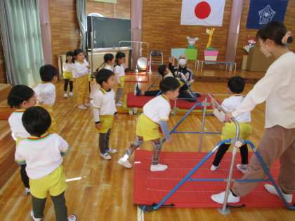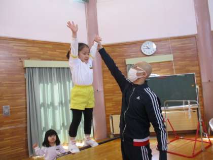 今日は体操教室がありました。子供たちは普段から鉄棒が好きで「足抜き回り・腰抜き回り」や「こうもり」の技に挑戦して遊んでいます。今日の体操教室でも、講師の先生がお手本を見せると「僕もできるよ!」「早くやりたい!」と言って、とても意欲的な様子でした。前回りの時には回転することを怖がる子もいましたが、その場にいる先生みんなで鉄棒から落ちないように体を支えることで安心して取り組みました。毎日お家の人に両手を持ってもらい「くるりん!」と鉄棒遊びをすることで上達が早くなるようですよ。また、家庭でも遊んでみてくださいね。