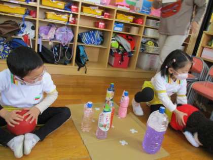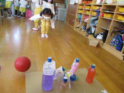 「クラスに楽しいゲームをつくりたい」という話になり、太鼓やボーリング・輪投げなどをつくっています。今日はクラスみんなでボーリングコーナーで遊びました。みんなでキャラクターや花の絵をかいてペットボトルに貼りピンにしました。全部のピンを倒すのを目標にし、狙いを定め転がし、何度も挑戦していました。