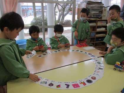 それが終わると、新しく用意した『しりとりカード』を使い、友達と考えながら文字をつなぎ合わせていく遊びをしていました。「次は『ら』だよ。誰か持っていないのかな」「だんだん丸になってきたね」と相談しながらしていました。