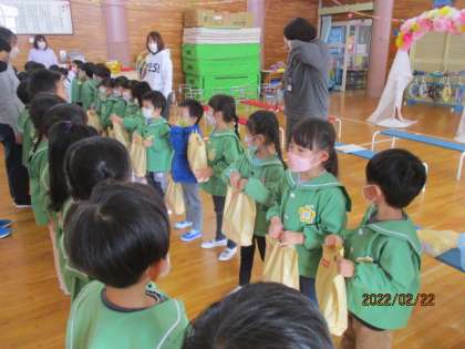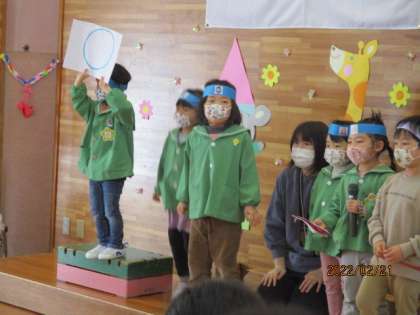 もうすぐ修了を迎えるぞう組さんのために、うさぎ組ではお別れ会を計画し、準備してきました。お別れ会の話し合いでは「うさぎ組のダンスを教えてあげたい」「ドッジボールの勝負をしたい」と、ぞう組さんと一緒にしたいことがたくさんあり、お別れ会を2日間に分けて開催しました。1日目は「ぞう組さんと一緒に遊ぼう」でダンスを一緒に踊ったり、クイズ係による〇×クイズ、ドッジボール大会がありました。2日目は、りす組さんのダンスを見たり、みんなで椅子取りゲームをしたり、ぞう組さんにプレゼントを渡したりして修了をお祝いしました。
