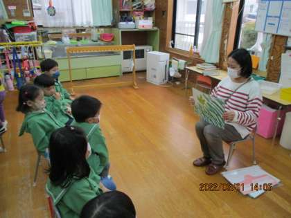 今日の読み聞かせ会では、紙芝居を読んでもらいました。みんなが大好きないろいろな生き物が出てくる紙芝居でした。参加型で、子供たちがみんなで声をそろえて掛け声を言うとバッタが跳んだり青虫がさなぎやちょうちょうになったりするので、みんな楽しく見ていました。お母さん方の読み聞かせ会は子供たちはもちろん、私たち教師も毎月楽しみにしています。りす組の読み聞かせは今日で今年度最後となります。1年間、毎回楽しいお話をありがとうございました。