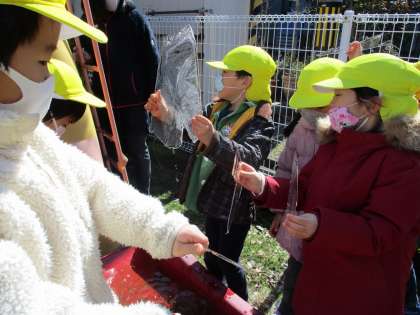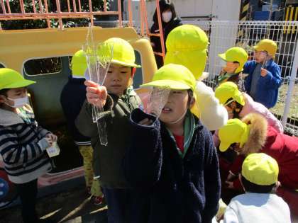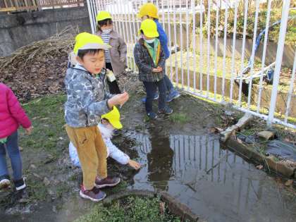 氷、見〜つけた!(5歳児 ぞう組) 公開日 2022/03/14 更新日 2022/03/14 今日のできごと 3月4日(金) 朝は冷え込む日が続き、子供たちとも「氷、できてるかな」と話しながら園庭に出ました。すると、花壇の横に置いてあった滑り台の中に氷を発見!「あったよ」「すごく大きい」と友達に伝え、静かにそっと触ってみました。氷がパキッと割れると歓声が上がり、大きな氷を持ち上げるとさらに歓声が上がりました。畑の水たまりにも氷を見つけ、冬の寒さを感じる瞬間になりました。
