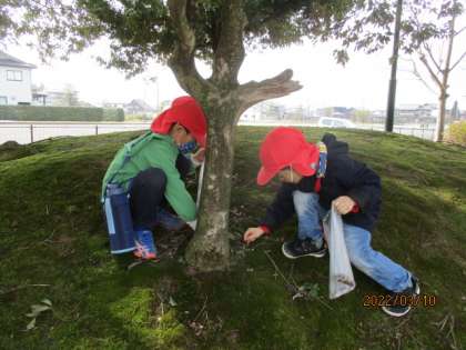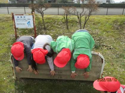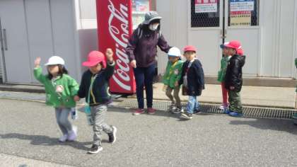 すっかり雪も解け、春らしい暖かい日が続いています。今日は交通安全指導も兼ねて、りす組さんと一緒に婦中スポーツプラザ公園に行きました。うさぎ組は、4月から年長児として年下の友達と一緒に散歩に行くので、横断歩道の渡るときに左右の確認を丁寧に行ったり、年下の友達に合わせて歩くことを意識したりしました。