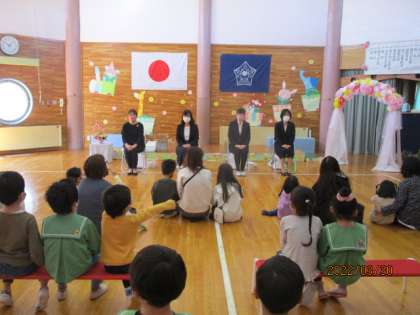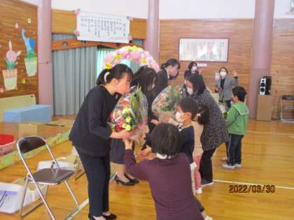 春の訪れとともに別れの季節となり、離任式で4人の先生方が異動になりました。たくさんの子供たちと保護者の方たちが、集まってくださいました。「先生大好き」「先生ありがとう」と子供たちから温かい言葉や手紙、手作りの首飾りや花束が贈られ、心温まる離任式でした。お別れするのは寂しいけれど、お元気で。また遊びに来てください。