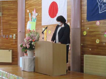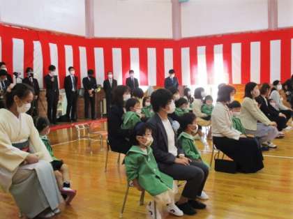 真新しいスモック姿で元気に登園した子供たちは、早く遊びたくてならない様子でした。入園式では、名前を呼ぶと元気に「ハイ」と返事できた子や、少し恥ずかしくて目線を向けてくれた子と様々でしたが、これからの園生活を楽しみにしていることがよく伝わってきました。