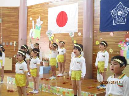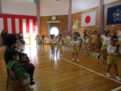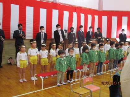 入園式(うさぎ組・ぞう組) 公開日 2022/04/13 更新日 2022/04/13 今日のできごと 4月11日(月) 今日は待ちに待った入園式がありました。今年は、りす組に入園してきた15名の友達に加え、ぞう組にも新しい友達が加わりました。うさぎ組とぞう組は、入園式の途中から参加し、園歌を一緒に歌いました。入園式後の新入園児の歓迎会では、ぞう組がこの日のために練習してきたお迎えの言葉や歌、ダンスを披露しました。ダンスでは、新入園児の友達も手拍子をして楽しんで見ていました。