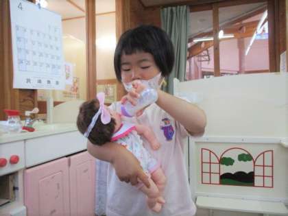 今日も元気に遊びました。保育室では、ままごとや電車遊びで近くにいる友達の様子をじっと見ている子や、同じ物が使いたくて「かして」と声を出している子と様々ですが、友達や教師の存在を感じているようで嬉しく思います。