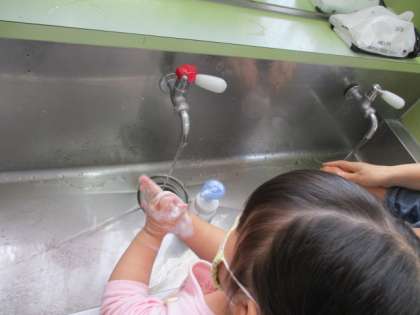 集まりでは、手洗いの仕方を話し、一人ずつ手洗い場の使い方やタオルでの拭き方を確認しました。手洗いが家庭でも徹底されていることが伺え、丁寧な洗い方に感心しました。