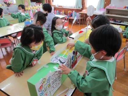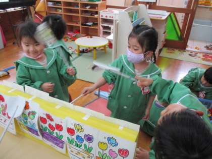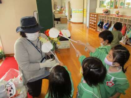 先日チューリップの塗り絵をして色とりどりの花が咲いています。そこにかわいい虫が集まったら楽しくなりそう、と思い、ちょうちょ、ミツバチ、てんとうむしの塗り絵を準備しました。塗り絵にチラシの棒を付けて動かすと、本当に虫たちが飛んでいるようです。「ちょうちょさん、こんにちは」と教師が声をかけると「こんにちは、お花を探しているの」「一緒に探しましょう」と数人が集まってきました。