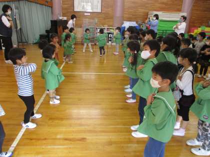 誕生会の後は、お楽しみ会がありました。みんなで「こいのぼり」を歌ったり、各クラスで歌っている歌や踊りを披露しました。りす組は、初めてお兄ちゃん、お姉ちゃん達の前で踊りを披露して、緊張もしていましたが、大好きな踊りを楽しんでいました。