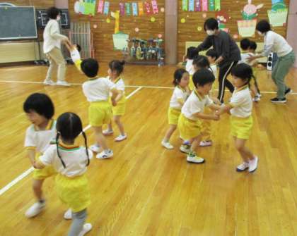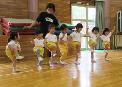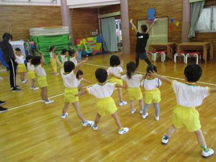 体操教室では、講師の先生の言われたことに元気に返事をしたり、動きを真似てみたりして楽しく参加できました。同時に2つ以上の動きをすることが難しく感じて「できない」と言っている子もいましたが、励まされるとやってみようとする姿が見られステキでした。これからは毎月一回、ボール、鉄棒、マット等を使った運動の仕方を教わります。講師の先生方に教わったことを保育にも活かしながら、運動遊びに親しんでいきたいです。