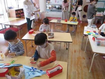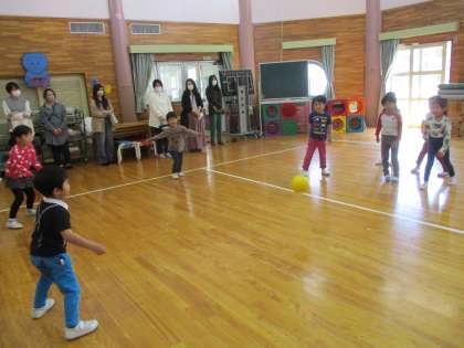 年長組の保育参観がありました。年中組から取り組んできたドッチボールを年長組になりお家の方に見てもらいました。チーム戦で競うゲームを行い、作戦を考えたりボールの投げ方を工夫したりと日頃から取り組んでいる姿を見てもらうことができました。また、こいのぼりの兜づくりをし「かっこいい兜を作ろう」と張り切っていました。制作した兜をかぶってこどもの日の集いに参加したいと思います。