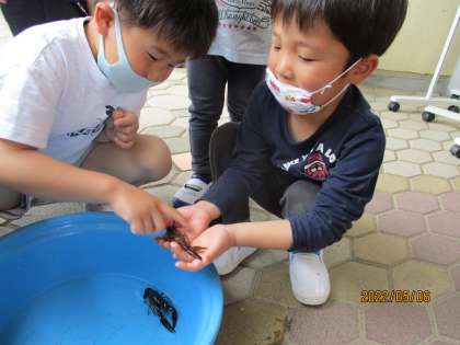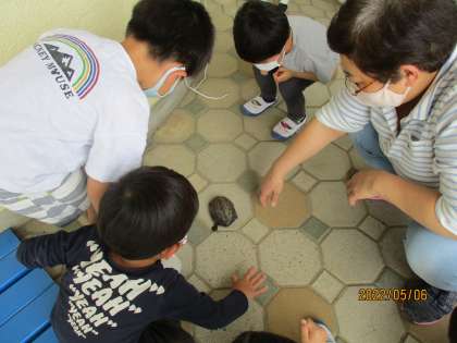 ザリガニとカメ吉のお世話をしたよ(4歳児 うさぎ組)