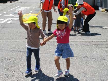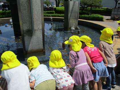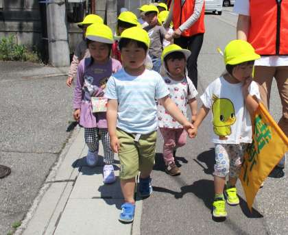 今日は、りす組のみんなで初めての散歩に出掛けました。先週から友達と手を繋ぐことや、並んで歩くことを園内や園庭で練習してきました。園外に出ることの期待感と道路を歩く緊張感ももたせながら出発!早速、園の前の道路脇の側溝には、子供たちの足なら落ちてしまう隙間があったり、段差があったりしてよく見て歩くことも大切だと知ることができました。速星小学校、児童館、婦中行政センターと園の周辺を歩き、花壇の花を見たり、行政センターの噴水のオブジェを見たりしてきました。帰り道は、少し遠回りをして園に戻りました。短い時間でしたが、散歩を楽しむことができました。道路の横断時の確認は、これから散歩に行く中で、子供たちが何を見て、何を確認するのかを繰り返し知らせ、安全への意識をもたせていきたいと思います。「今度は電車を見に行こう〜!」と次の散歩への期待も高まっている子供たちです。