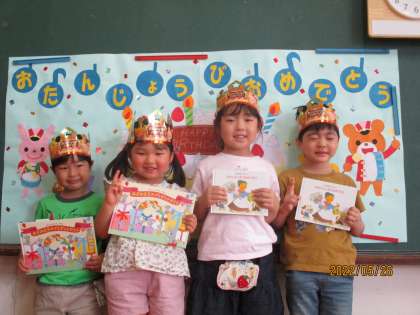 5月の誕生会 公開日 2022/05/29 更新日 2022/05/29 今日のできごと 5月26日(木) 5月生まれのお友達をお祝いしました。誕生会では、4名の誕生児の紹介をし、歌を歌ったり、質問をしたりしてお祝いしました。 お楽しみ会では園庭で、3年齢が仲良く集まれる人数集めゲームをしました。年長児は年少児や年中児をリードしながら、言われた人数の友達を誘い集まる姿が見られました。おやつに、豆乳プリンを食べ楽しい時間を過ごしました。