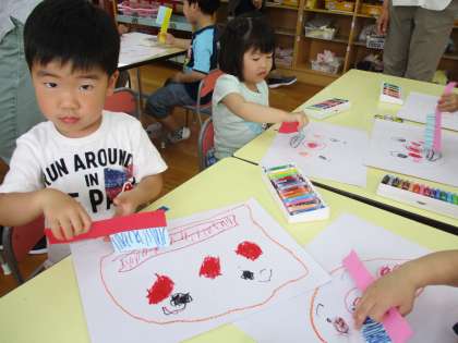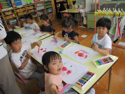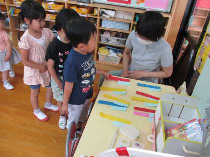 虫歯予防にちなんで、歯ブラシの製作をしました。歯ブラシ屋さんの先生に「〇色の歯ブラシください」と言って、歯ブラシをもらいました。マジックで上から下にまっすぐの線を描くことを知らせると、丁寧にゆっくり描いていた子供たちです。自分の歯を磨く真似をしたり、自分で描いたアンパンマンの歯を磨いてあげたりして楽しみました。歯磨きの習慣をつけて、歯を大切にすることも知らせていきたいですね。