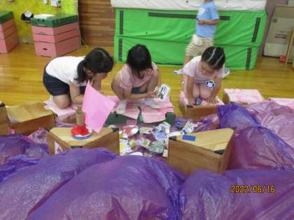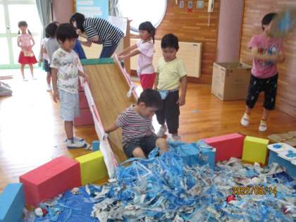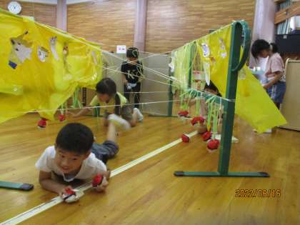 ぞう組みんなでアイディアを出し合って作ってきた遊び場「ポケモンひみつの島」で遊んでいます。ポケモンに詳しい子供たちも、ポケモンをよく知らない子供たちもみんなで遊べる楽しい遊戯室になっています。4つのタイプの遊びのコーナーがあり「悪・毒タイプのモンスターのトントン相撲したい」「電気タイプの的あて、なかなか入らないよね」と、自分たちで作った遊び場で毎日汗だくになって遊んでいます。遊んでいくうちに、もっともっと楽しくしたいな!と工夫しながら考えてつくっています。先週から年少・年中さんも招待し、それぞれの遊び場を案内したり優しく遊び方を知らせたりする姿も見られました。