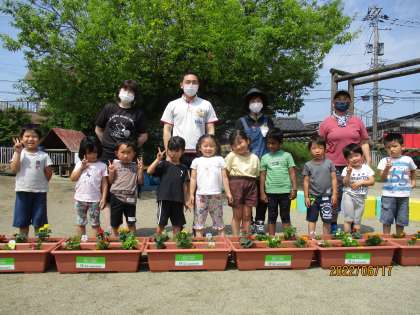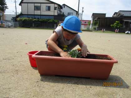 今日は、コメリ宮野店さんと一緒に花の苗植えをしました。子供たちは、先日の年長組の花苗植えを思い出し「土に穴をあけていたよ」「花は3つ選んでいたよ」と花苗植えを楽しみにしていました。一人ずつプランターにマリーゴールドやサルビア、ベコニア、ポーチュラカから3つを選んで植えました。子供たちは、花の名前を教えてもらい、植え方を教えてもらいながら、土に穴をあけたり、手をチョキにして苗が折れないようにそっと苗ポットから抜いたりすることができました。最後に、水やりをして、自分のプランターをずっと眺めていました。来週から、毎日水やりをして、きれいな花が咲くことを楽しみにしたいと思います。