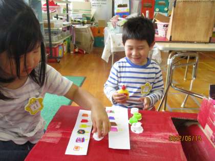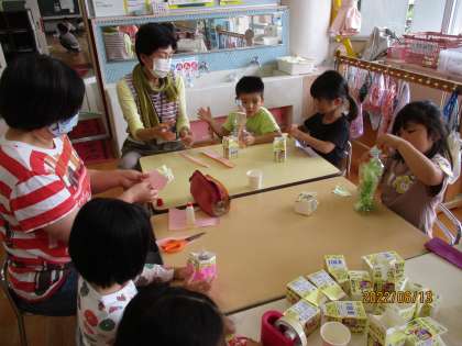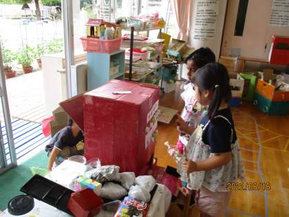 電車ごっこで遊ぶ中で「駅には自動販売機があるよ」と家で考えてきた友達がいました。友達の話を聞いて「私もつくりたい」「りんごジュースもつくろう」といろいろなジュースをつくりました。うさぎ組の自動販売機は「りんごジュースにしよう」とボタンを押しながら言うと、友達が自動販売機の後ろからジュースを入れてくれます。ボタンを押してもジュースが出ないことがあり、その時はジュースを入れてくれる子が「何にしますか」と優しく聞いてくれます。そう考えてみると…全然『自動』ではないのですが、このやり取りが子供たちにとっては面白く、また、自動販売機をイメージして遊んでいるのです。子供たちは、その他にも電車に乗って、お弁当やジュースを買いに行くことも楽しんでいます。