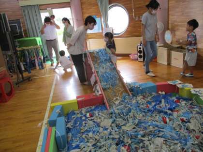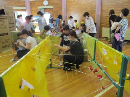 今日は5歳児の保育参観がありました。今日は、4月後半から話し合い、作り遊んできた「ポケモンひみつの島」でお家の人たちに遊んでもらうことにしました。「ここはモンスターボール取るんだよ」「ゴーストタイプはここだよ」「私の描いたポケモンだよ」と嬉しそうにお家の方に説明しながら親子で遊ぶ姿が見られました。自分たちで作ってきた遊び場でお家の方に遊んでもらい「楽しかったよ」と聞き、子供たちも喜んでいました。お家の方も滑り台を滑ったり、狭い段ボールのトンネルを通ったりして真剣に子供たちの説明に耳を傾け、一緒に楽しんでくださいました。