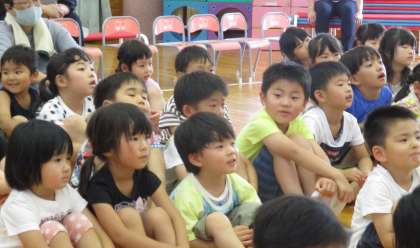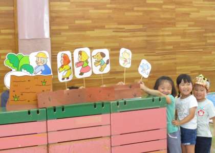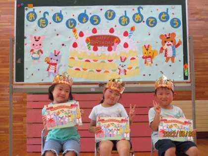 お楽しみコーナーでは「大きなかぶ」のペープサートを見ました。よく知っている話なので「うんとこしょ、どっこいしょ」と自然と声が出ていました。ところが、ねずみが引っ張てもかぶは抜けません。そこで、6月の誕生児の友達に手伝ってもらい「すっぽ〜ん!」と抜けたのでした。おやつに「バナナババロア」を食べ、楽しい誕生会になりましたね。