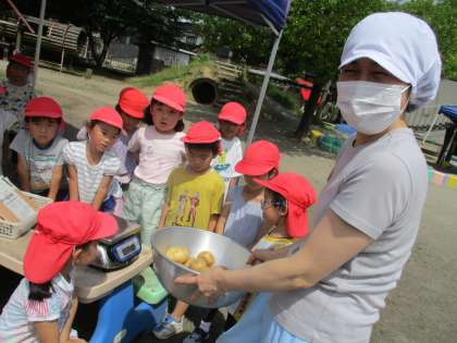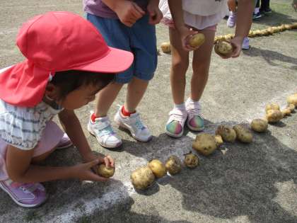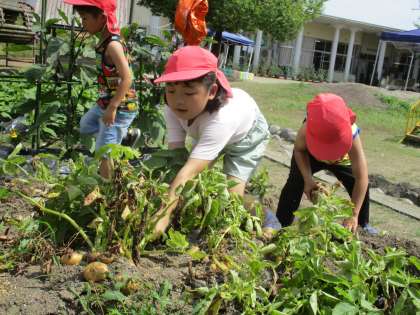 幼稚園の畑のジャガイモを収穫しました。昨年度末に種芋から植えたジャガイモが目を出し大きく育ち、花を咲かせていました。「なんだか、枯れてきたけど大丈夫なのかな」と心配し、図鑑で調べると「黄色く色が変わってきたら掘るとき」と知り、掘ることになりました。たくさんのジャガイモが育っていますように…とジャガイモの茎を引っ張る子供たちでした。「固いね、ギュッと力を入れよう」と掘ってみると根にたくさんのジャガイモが連なってきて「すごーい」「いっぱいだ」と大歓声でした。収穫したジャガイモの数をみんなで数えてみると330個ありました。7月19日、1学期の給食終了日にはカレーパーティーをし、年長児が調理し全児でいただきます。カレー用のジャガイモを給食の先生に渡し、残りはお家にもお土産で持ち帰りました。お家ではどんな料理に変身したのかな?次の日には「おいしかったよ」という声が聞かれました。