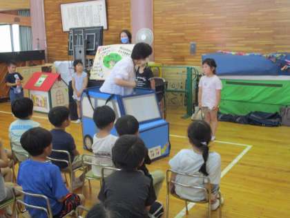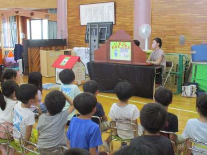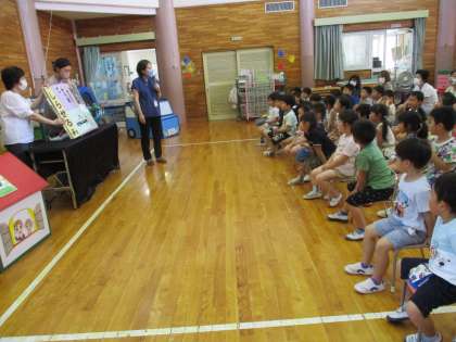 富山県防犯協会の指導員の方が来てくださり、防犯教室をしました。知らない人に声をかけられたらお「ひとりにならない」「大声を出す」「ついていかない」と3つの約束を教えてもらいました。声をかけられたときにはどうしたらよいのかを年長の代表の子と一緒に「たすけて」「行きません」と言うことを練習をしました。「大きな声を出して逃げるってドキドキするね」という声も聞かれました。自分の身を守る大事なことを知る機会になりました。