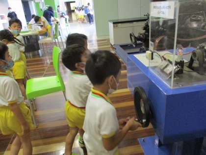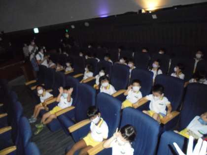 科学博物館へプラネタリウム観覧へ行ってきました。入口のマンモスの前で記念写真を撮り、館内を見学しました。ティラノサウルスの「ティラちゃん」を見て「大きいね」「しっぽが長い」と手を広げて長さを確認したり、2階の展示物をいろいろ試して遊ぶことができました。プラネタリウム観覧では、室内が暗くなると「ドキドキする」とい言いながら「星空いっぱいになると「わぁ、きれいだね」と歓声があがりました。星座の名前を教えてもらったり、月のお話を見たりと楽しい時間を過ごすことができました。