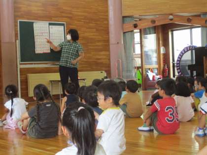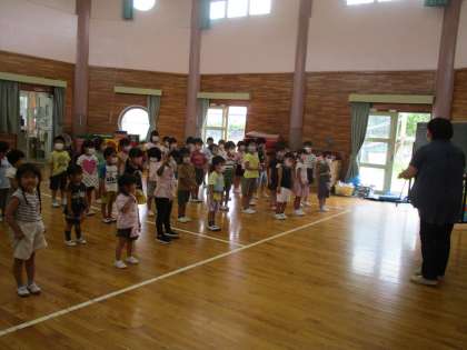園長先生から「夏休みには「は・や・ほ・しの約束」は→早寝早起き朝ごはん、や→やってみよう・試してみよう、ほ→本を読もう、し→知らない人についていかない、事故にあわない」ということを守って元気に過ごしてくださいね」とお話を聞きました。また、1学期の「楽しかったこと」や「うれしかったこと」を話しました。「鉄棒ができるようになった」「ちょうちょや電車ごっこ楽しかった」「野菜の苗を植えて収穫ができてうれしかった」などいろいろな経験したことを嬉しそうに話しました。