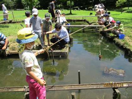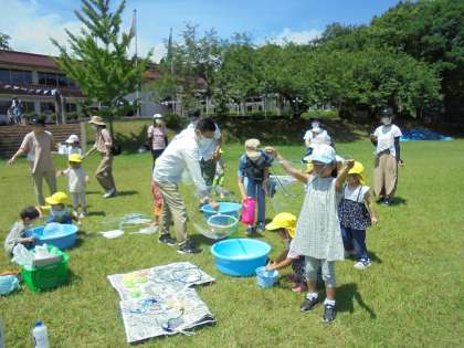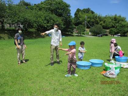 しゃぼん玉遊びとザリガニ釣りで遊んでいる様子です。