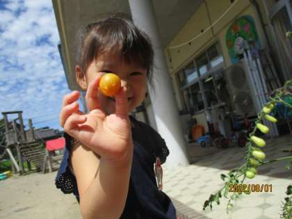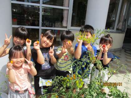 年中児のうさぎ組が育てたトマトを、預かり保育に来ていた友達と一緒に収穫しました。1学期の間は、トマトの実が青いままでず収穫することができませんでしたが、夏休みに元気に育ち、赤、黄色のたくさんのトマトが実っています。今後まだまだトマトの実が色づくと思うので、ぜひ、近くに来たときは見に来てね〜