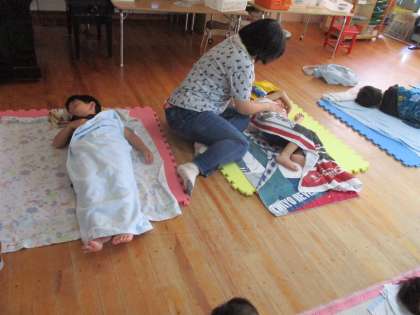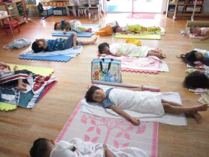 午前中はプール遊び、水遊びをたっぷり楽しみ、お家の人の手作り弁当を食べた後、午睡を行っています。ゴロンと横になりすぐに寝むりにつく子や横になって体を休める子といます。