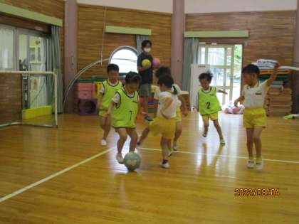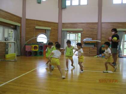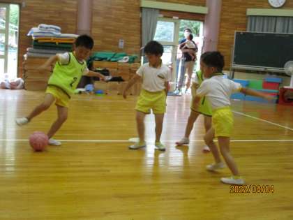 PTAサッカー教室 公開日 2022/08/04 更新日 2022/08/04 今日のできごと 8月4日(木) 今日は、PTAサッカー教室がありました。園では、毎月2回程、PTAサッカー教室を行っています。今日はあいにくの雨で、園庭ではなく遊戯室での教室となりましたが、子供たちは、試合中にも「○○君、パス!」と元気に声を掛け合い、シュートをしたり、相手のボールを取りに行ったりと積極的に取り組んでいました。