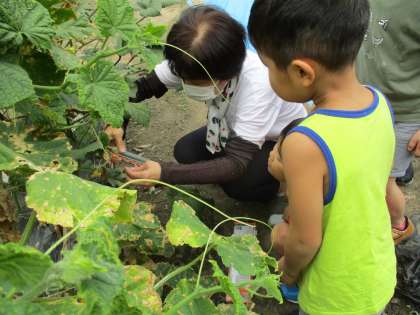 畑のキュウリの形を変えることに挑戦してみました。星形とハート形にできる型を、大きくなっている途中のキュウリにはめてみることにしました。「ほんとにハート形になるのかな?」と不思議そうに見ていました。最近はキュウリの生長が早く、一日で巨大化してしまうほどです。「明後日、幼稚園に来た時のお楽しみだね」と登園を楽しみな様子の子供たちでした。