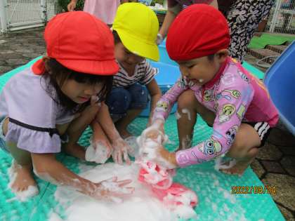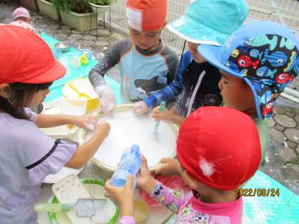 お盆が過ぎると涼しくなり、少し肌寒い日もありますね。今日は、石鹸を使って泡遊びをしました。泡で遊ぶことが初めての友達も多く、泡だて器で混ぜるとべちょべちょだった泡がふわふわになることを自分でつくってみて驚いていたり、手につけてふわふわの感触を楽しんだりしていました。
