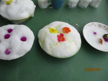 幼稚園には、きれいな花が咲いているので、つくった泡のケーキに上に花をのせて可愛くデコレーションをしました。また、絵具で色をつけるなど、遊び方はたくさん!明日からも泡遊びを楽しんでいきたいと思います。