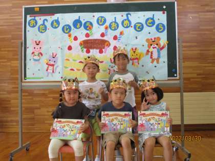 今日は夏休みの登園日。8月生まれの誕生会でした。今月は5人の友達をお祝いしました。質問コーナーでは「好きな魚は何ですか」と聞かれると、アジやシュモクザメ、タコなど自分の好きな魚を考えて答えていました。