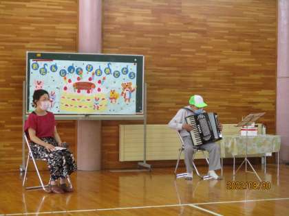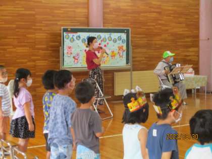 お楽しみ会では、園児のおじいちゃがアコーディオンで様々な曲を演奏してくださいました。子供たちは初めて見るアコーディオンに夢中で、かえるの合唱などの歌を一緒に歌ったり、曲当てクイズをしたりして楽しみました。