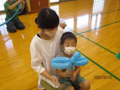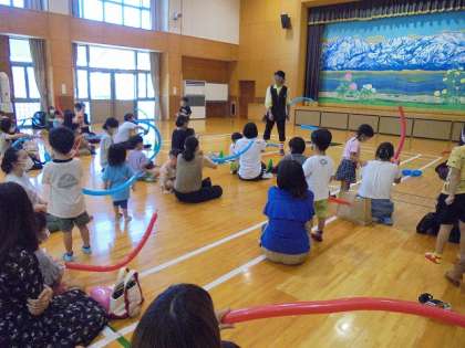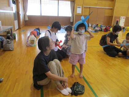 ZUTAさんが、「親子で楽しめるものを」という、PTAさんの意向を組んで、パフォーマンスに組み入れてくださったのが、親子でバルーンアート。バルーンでとんぼ作りに挑戦しました。ところが予想もしなかった事態に…。新しい風船をこの日のために準備してくださったはずが、あっちでパン!こっちでパン!、パン!パン!パン!と次々に風船が割れる音が響き大変なことに。慌ててPTA役員さんと教師で追加の風船を大量に膨らます事態となりました。帰りには一人に一つ持ち帰ることができて満足そうな子供たちでした。