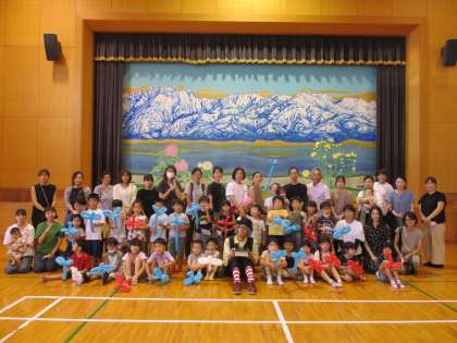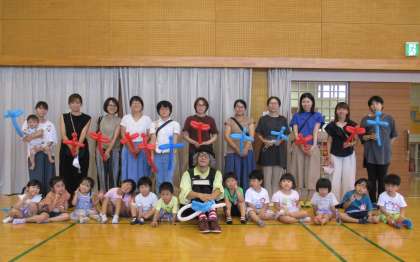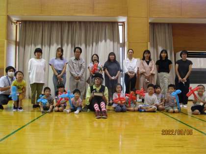 親子イベント パート3 公開日 2022/09/07 更新日 2022/09/07 今日のできごと 道化師ZUTAさんと一緒に記念写真を撮りました。親子で一緒に笑ったり、声を出したり、驚いたり、びっくりしたり…。短い時間でしたが、楽しい時間をありがとうございました。