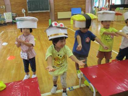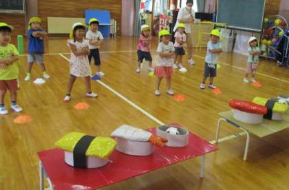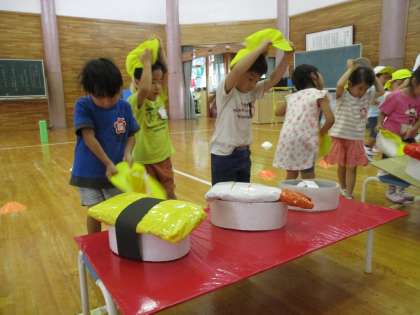 運動会に向けてみんなで踊っています。寿司の帽子が少しずつ出来上がってきたので、今日は、途中で寿司の帽子に変えるところを練習しました。自分の帽子が嬉しくてニコニコの子供たち、昨日までお面で練習していたように被ることができました。掛け声が大きくなったり、決めポーズの腕がピーンと伸びたり日々進化しています。初めての運動会ですが、みんなと活動する楽しさや、頑張る気持ち、いろいろな感情を味わえる体験となるよう、毎日の活動を計画していきたいです。