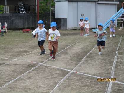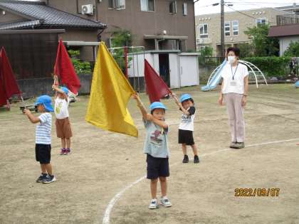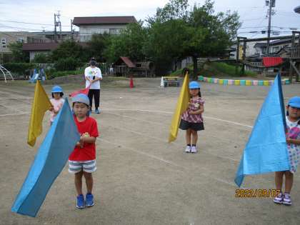 運動会に向けて、友達や先生と一緒にかけっこやフラッグを頑張っています。かけっこでは、1学期よりもみんな足が速くなり、何度も友達と一緒にかけっこを楽しんでいます。